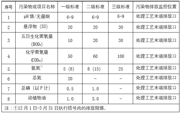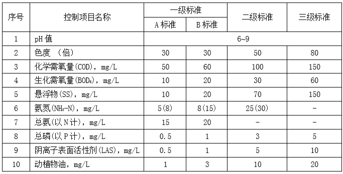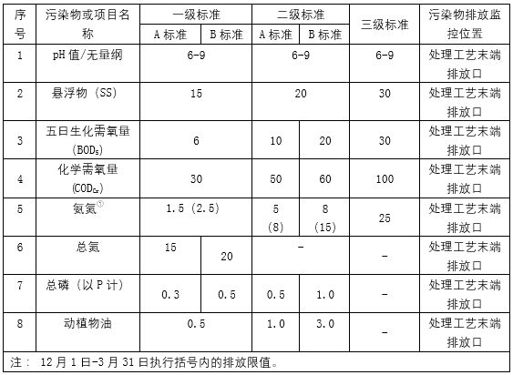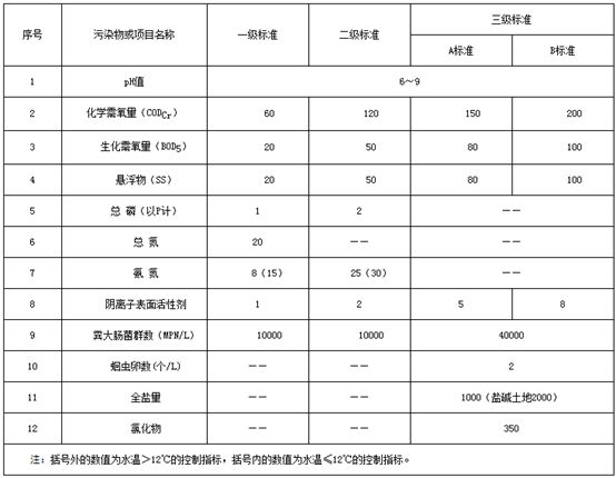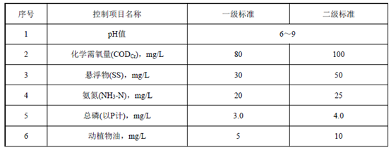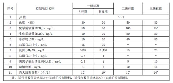 出水排入其它水體的處理設(shè)施執(zhí)行二級(jí)標(biāo)準(zhǔn)。其中,規(guī)模大于50m3/d(含)的處理設(shè)施執(zhí)行A標(biāo)準(zhǔn),規(guī)模在50m3/d(不含)-5m3/d(含)的處理設(shè)施執(zhí)行B標(biāo)準(zhǔn)。