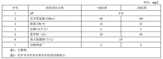 2015年7月,浙江《農(nóng)村生活污水處理設(shè)施水污染物排放標(biāo)準(zhǔn)》發(fā)布實(shí)施,規(guī)定農(nóng)村生活污水排放必須達(dá)到規(guī)定的排放標(biāo)準(zhǔn)。《標(biāo)準(zhǔn)》確定了pH值、化學(xué)需氧量、氨氮、總磷、懸浮物、糞大腸菌群、動(dòng)植物油等7項(xiàng)主要控制指標(biāo)及限值,詳情如下: