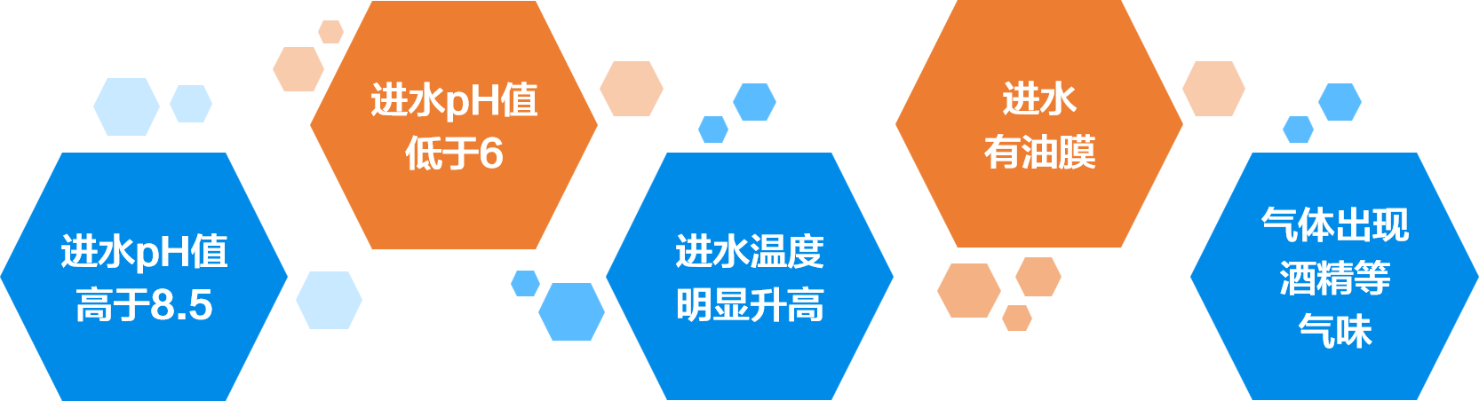 出水銨氮值過低;渾濁度升高;進水量過高;回流污泥泵運行故障;pH值過低或過高;污泥被機械粉碎;亞硝酸鹽含量升高。