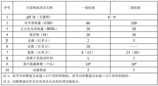 出水排入其它水體的處理設(shè)施執(zhí)行二級(jí)標(biāo)準(zhǔn)。其中,規(guī)模大于50m3/d(含)的處理設(shè)施執(zhí)行A標(biāo)準(zhǔn),規(guī)模在50m3/d(不含)-5m3/d(含)的處理設(shè)施執(zhí)行B標(biāo)準(zhǔn)。