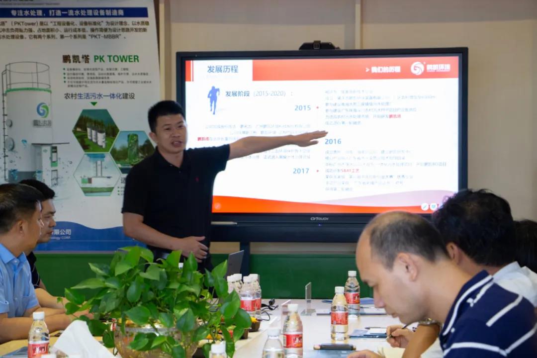鵬凱環(huán)境王國彬董事長、技術(shù)研究院胡勇有院長及公司高管熱情接待調(diào)研組一行領(lǐng)導(dǎo),并由鵬凱環(huán)境王國彬董事長向廣東省環(huán)境保護產(chǎn)業(yè)協(xié)會易頌輝秘書長一行領(lǐng)導(dǎo)就鵬凱環(huán)境的發(fā)展歷程,近期工作成果、技術(shù)研發(fā),專利技術(shù)應(yīng)用情況以及未來的發(fā)展規(guī)劃進行了詳細的匯報,讓調(diào)研組一行更全面、更深入地了解我司發(fā)展狀況。