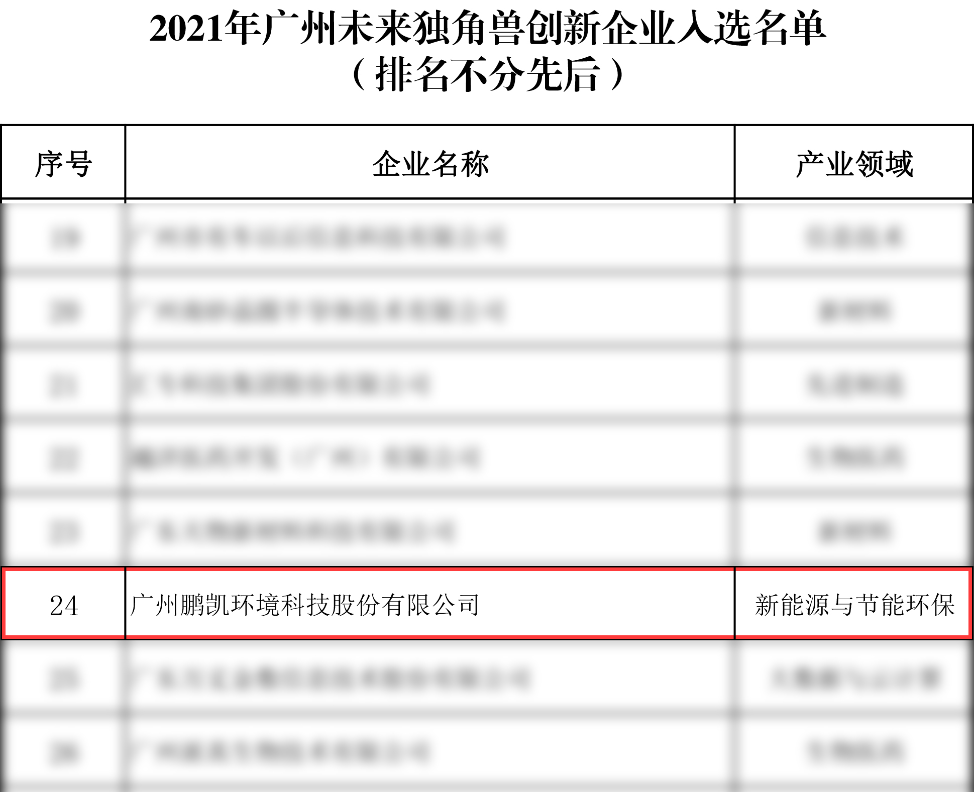 近日,廣州市科技創(chuàng)新企業(yè)協(xié)會(huì)發(fā)布《關(guān)于2021年廣州“獨(dú)角獸”創(chuàng)新企業(yè)榜單遴選結(jié)果公示》,廣州鵬凱環(huán)境科技股份有限公司成功入選“2021年廣州未來(lái)獨(dú)角獸創(chuàng)新企業(yè)”榜單。