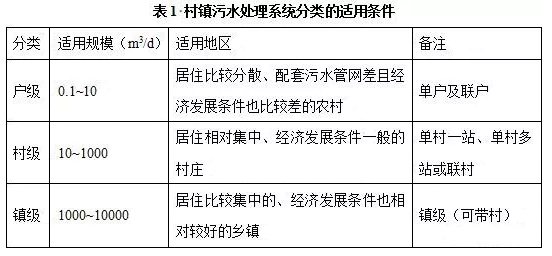 結(jié)合我國(guó)村鎮(zhèn)及村鎮(zhèn)污水的特點(diǎn),可以將我國(guó)村鎮(zhèn)污水處理按照規(guī)模大小系統(tǒng)的分為戶級(jí)、村級(jí)和鎮(zhèn)級(jí)3種集中程度不同的農(nóng)村污水處理系統(tǒng),適用條件如表1所示。